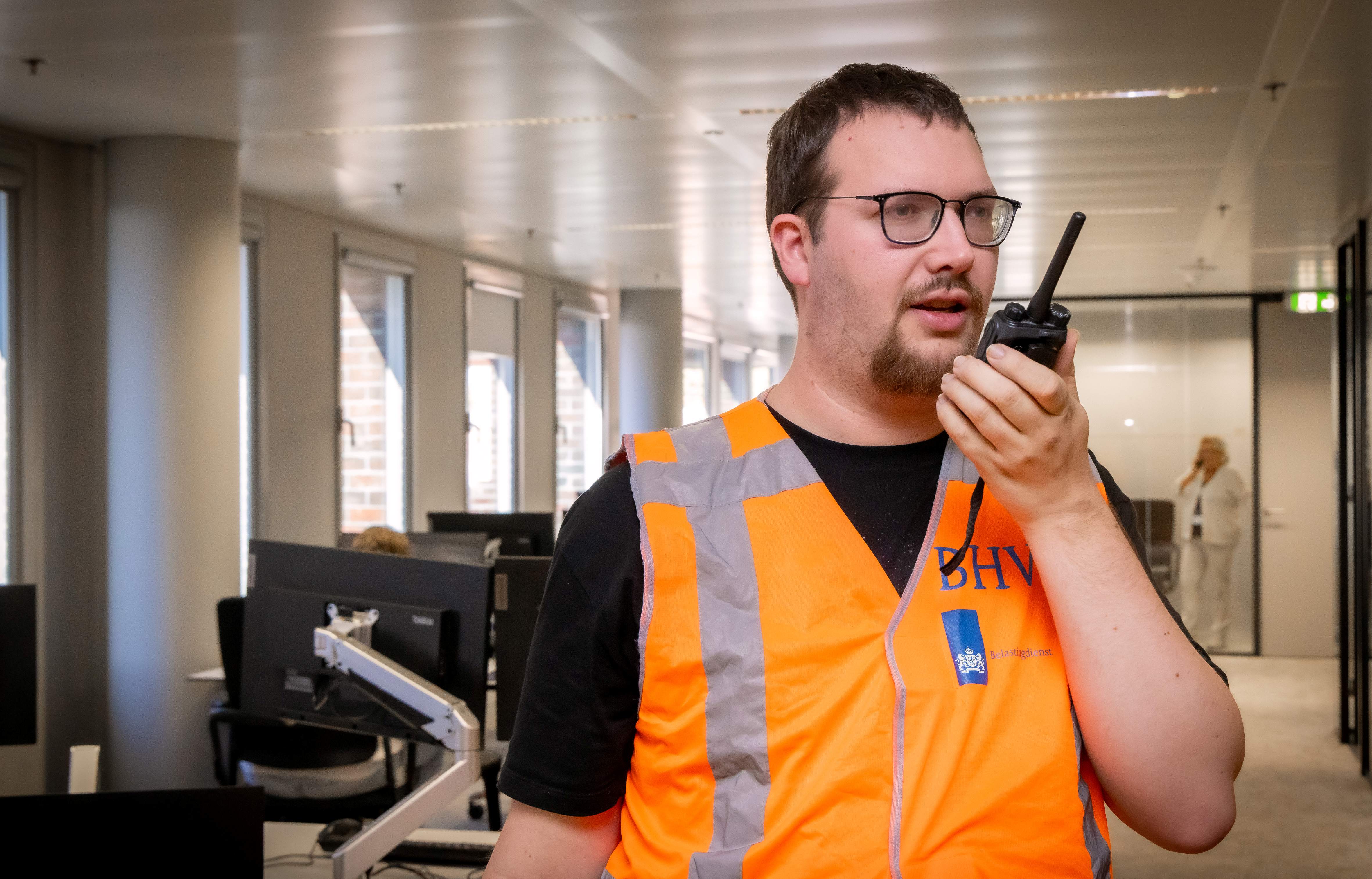 BHV ‘er op het belastingkantoor in Breda. Een functie die hij gevarieerd invult, bijvoorbeeld door oefeningen te coördineren en oog te hebben voor zijn collega’s tijdens zijn dagelijkse veiligheidsrondjes. Jeffrey licht zijn functie toe: “Je kijkt altijd even hoe iedereen erbij zit en of de vluchtroutes helemaal leeg zijn. Daarnaast moet je altijd alert zijn, zoals tijdens die ogenschijnlijk rustige werkdag begin dit jaar. Door een gesprongen leiding stroomde het water ineens uit de liftdeuren. Het werd glad op de werkvloer, dus moesten we direct de hoofdschakelaar uitzetten en tot ontruiming overgaan. Dit gebeurde via de trappenhuis buitenom. Gelukkig was iedereen fysiek in staat om deze vluchtroute te nemen. Gebruik van aanvullende fysieke hulpmiddelen voor ontruiming van het gebouw waren niet nodig”, kijkt Jeffrey terug op deze calamiteit.